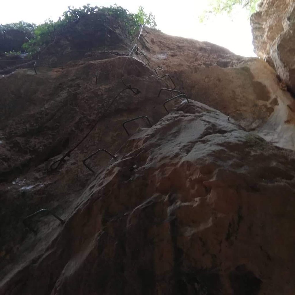 Ferrata muy exigente de brazos, muchos pasos horizontales con cadenas, clavijas y tirolina, ojo con esta que se llega muy rápido a la pared,